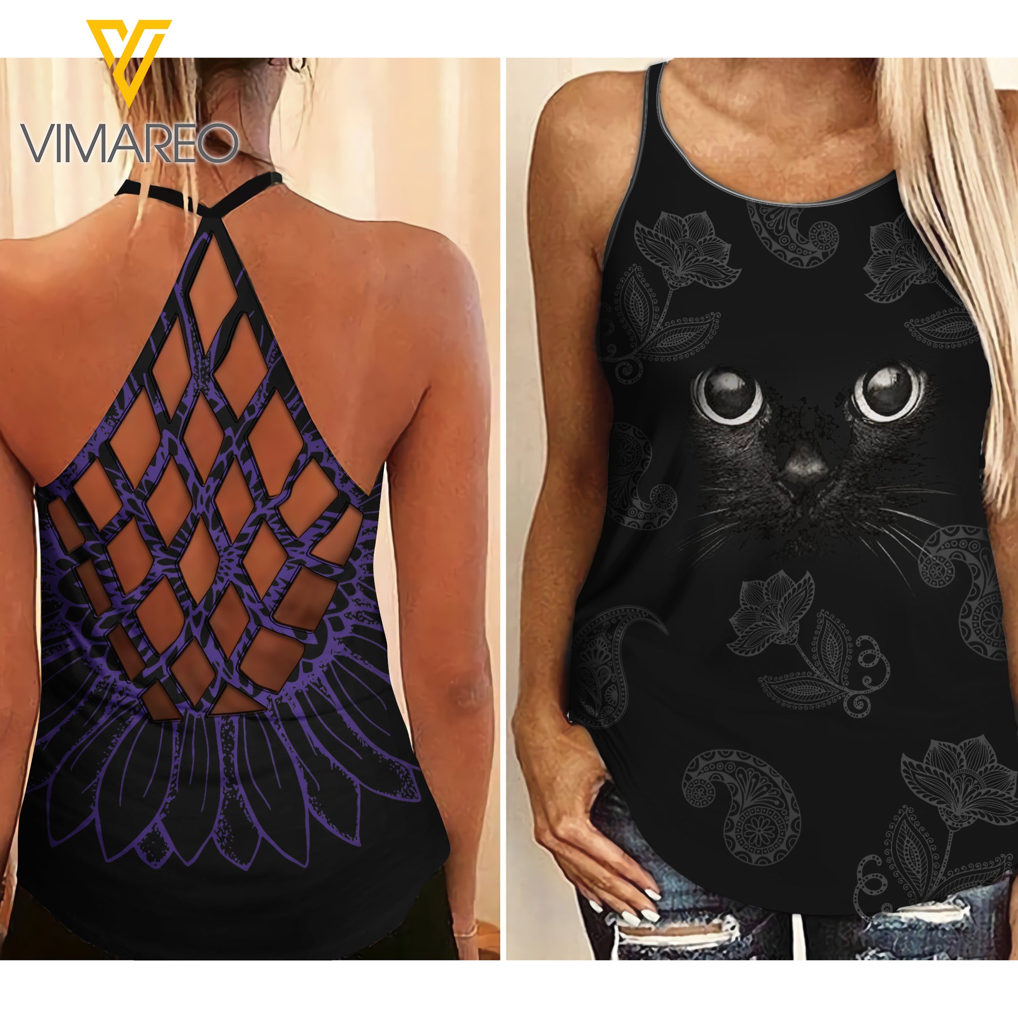 KA Black Cat Criss-Cross Open Back Camisole Tank Top